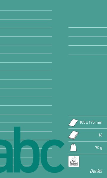 Produceret af 70 g papir. 102x170mm, linjeret 7mm, uden midterlinje, 16 blade.