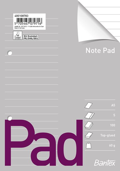 Online katalog » Notesbøger og blokke » Notesblokke » Limet » Bantex » A5 - Toplimet » Bantex standardblok A5, Linjeret, hullet, toplimet