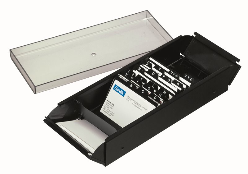 Visitkortkartotek fremstillet i sprøjtelakeret metal og med røgfarvet låg. Leveres med 20 stk. indekskort i PP-folie, der er påmonteret glideskinner og har påtrykt alfabet A-Z. Til visitkort i max. format, 55 x 90 mm.
