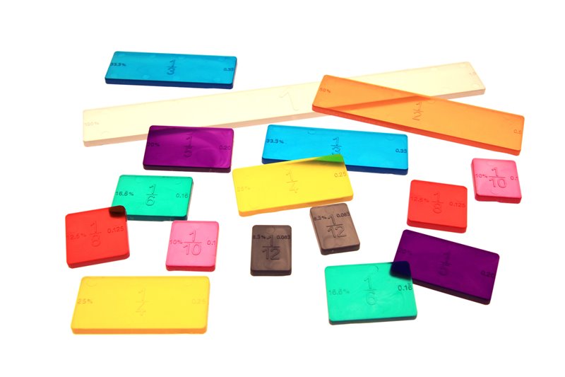 Viser 1/1, 1/2, 1/3, 1/4, 1/5, 1/6, 1/8, 1/12, Hver fraktion har sin egen farve og er markeret, Format 1/1 = 24×2,4 cm, plast.