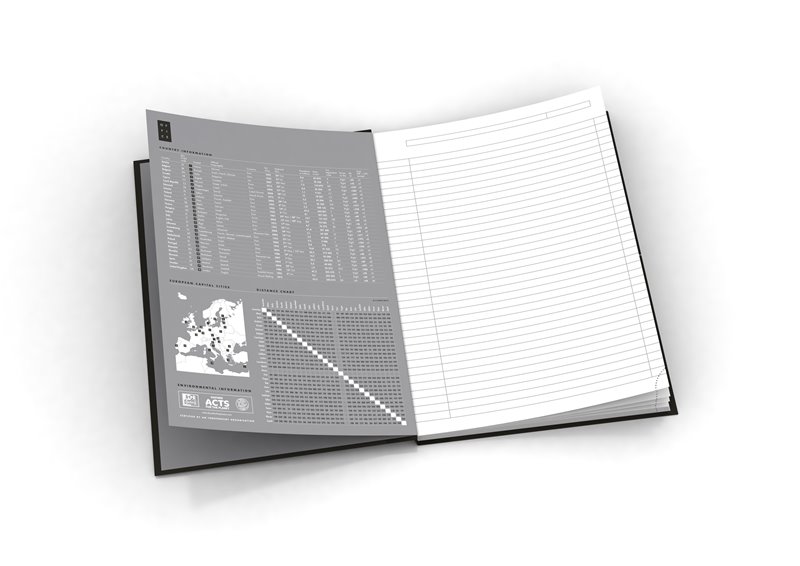 Den fleksible, syede ryg kan ligge helt fladt, når bogen er åben, og det hårde omslag udgør et solidt underlag, hvilket gør det behageligt at skrive i enhver situation. Hårdt omslag med en beskyttende blank finish i sort.